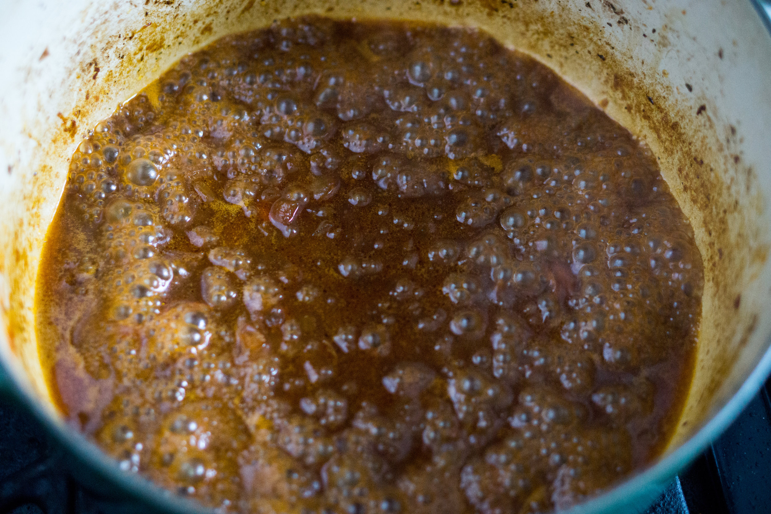 In a large pot over medium heat, add your oil. When the pan is hot add the sugar and allow it to bubble and darken. It should froth up a bit but don’t let burn. You’re aiming for caramelized and dark. Keep an eye on it because it can go very quickly.